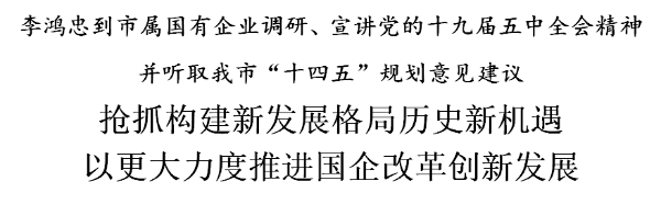 本報訊(記者 魏彧 于春灃)17日,市委書記李鴻忠深入市屬國有企業(yè)調(diào)研、宣講黨的十九屆五中全會精神,并聽取我市“十四五”規(guī)劃意見建議。李鴻忠強(qiáng)調(diào),要堅持以習(xí)近平新時代中國特色社會主義思想為指導(dǎo),認(rèn)真學(xué)習(xí)貫徹黨的十九屆五中全會精神,深入貫徹新發(fā)展理念,搶抓構(gòu)建新發(fā)展格局歷史新機(jī)遇,找準(zhǔn)自身定位,毫不動搖鞏固和發(fā)展公有制經(jīng)濟(jì),以更大的力度推動國企改革創(chuàng)新發(fā)展,切實促進(jìn)國有企業(yè)不斷做強(qiáng)做優(yōu)做大。
